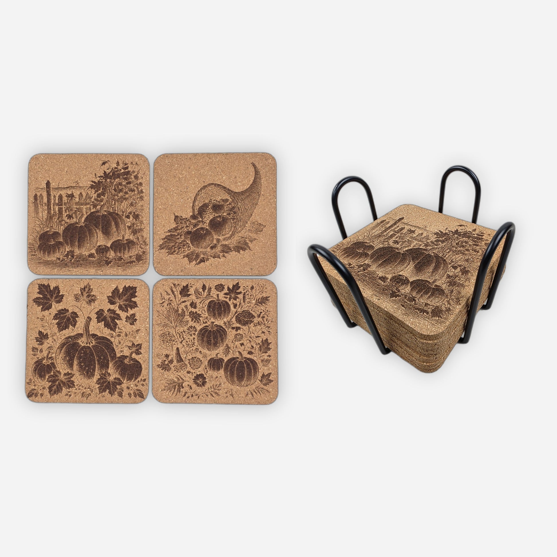 Festive Fall and Thanksgiving Cork Coasters Set of 8 with Black Holder